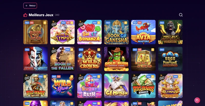 Nous travaillons avec un mélange de développeurs réputés et en forte croissance, ce qui aide à garder un catalogue équilibré. Nos partenaires incluent Pragmatic Play, Relax Gaming, Hacksaw Gaming, Red Tiger Gaming, Spribe, Evolution Gaming, Spinomenal, Gamomat, Nolimit City et Push Gaming. Le contenu live dealer est fourni par Evolution, tandis que le jeu de type crash est représenté par des studios comme Spribe.