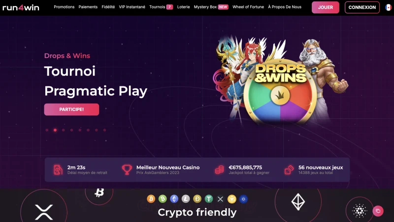 Nous avons lancé Run4win Casino en 2023 avec un objectif : rendre le jeu en ligne simple à comprendre et facile à utiliser. Sur notre site, les joueurs en France peuvent choisir parmi 14 331 jeux, alterner entre l’EUR et les cryptos, et trouver les règles clés des bonus et des paiements sans passer des heures à chercher. Nous gardons une navigation épurée, avec un accès rapide à la caisse, aux promotions et aux filtres de jeux.